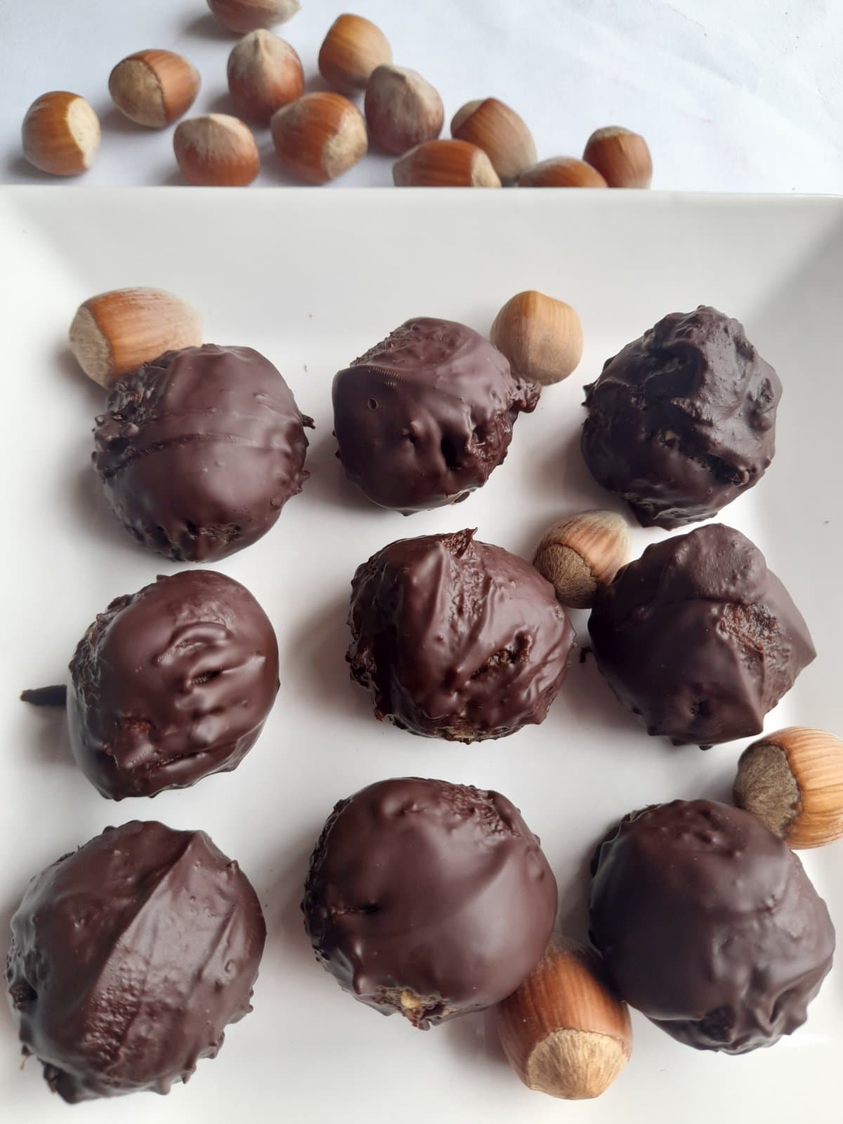 Урмите се сечкаат најситно, им се додваат лешници, цимет, овсени снегулки и растопен путер. Масата треба да е компактна, и сега се обликуваат топчиња. Последен чекор е топеното црно чоколадо- топчињата се велааат во него, а доколку сакате уште вкусови, извалкајте ги и во кокосово брашно, мелен кекс или мелени ореви.